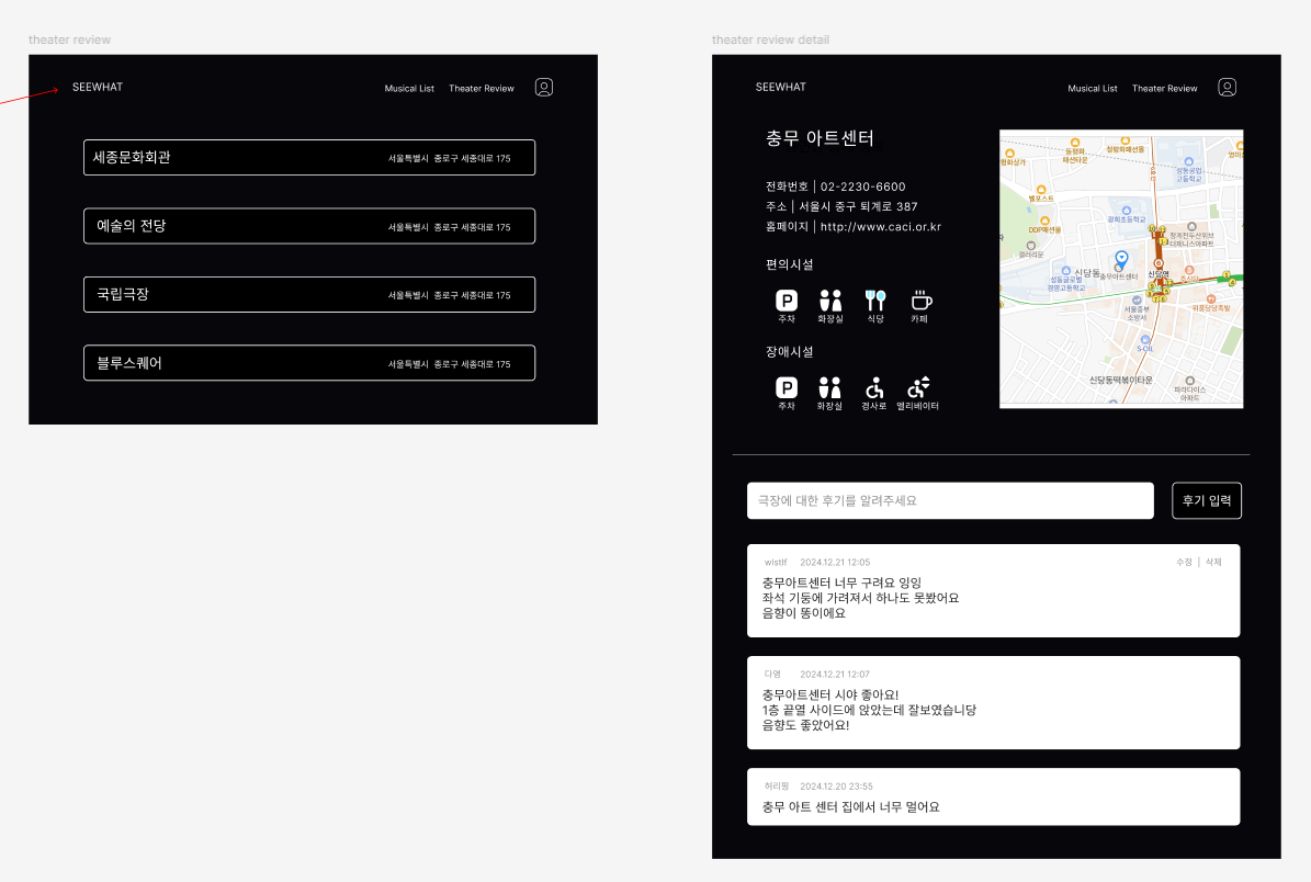 여기서 나는 한 팀원과 같이 공연장 리스트, 공연장 리뷰 페이지를 맡게 되었다.