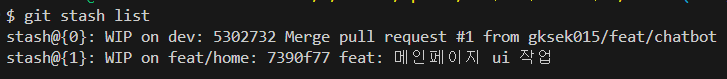 => git stash로 저장된 변경 사항은 다시 git stash pop을 이용해 꺼낼 수 있다.