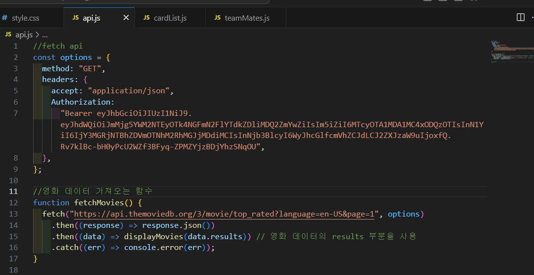 TMDB에서 가져온 api를 붙여놓고 fetch부분을 fetchMovies라는 이름의 함수로 선언해준다.